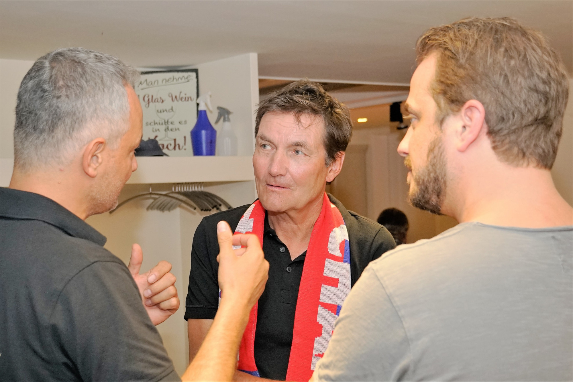 Aufmerksame Besucher entdeckten bereits beim Apéro ein bestens bekanntes Gesicht unter den Gästen. Fit, kommunikativ und aufgestellt präsentierte sich mit einer Cham Schärpe kein Geringerer als der ehemalige Schweizer Starkoch und TV-Gastrokritiker Daniel Bumann mit Ehefrau. Wie kommt es, dass er schon vor sieben Jahren in der Sendung «Gastrobus» eng mit dem Verein zusammenarbeitete und auch im Jubiläumsjahr einen Abstecher vom Tessin an den Zugersee machte. Wie kann es anders sein: persönliche Freundschaft! Noch in seiner Aktivzeit als Spitzengastronom im Engadin lernte er Chams heutigen Teammanager und seine Familie kennen. Aus den verschiedenen Besuchen entwickelte sich eine tiefe, von gegenseitigem Respekt geprägte Freundschaft zwischen den beiden Familien, die weiter andauert. Sie führte auch dazu, dass Dani Bumann die Entwicklung des Vereins aktiv mitverfolgt, ihm die Daumen drückt und ihn zum Besuch der Tavolata motivierte.